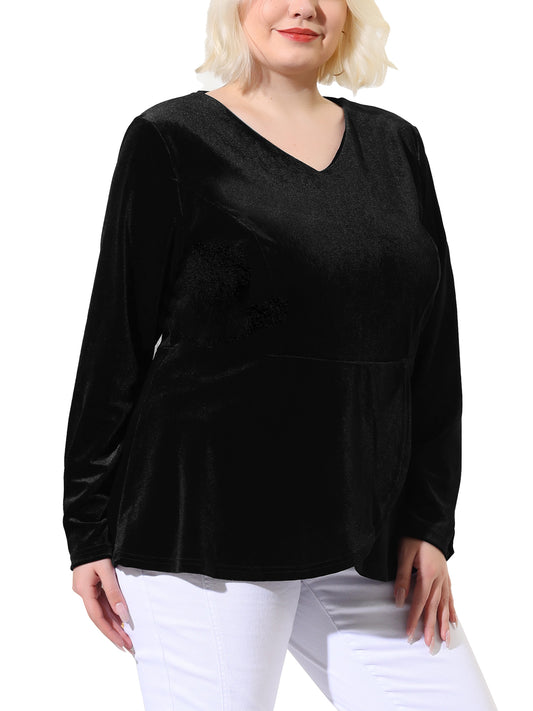 Women's Plus Size Velvet Velour V Neck Tulip Hem Long Sleeve Peplum Blouse