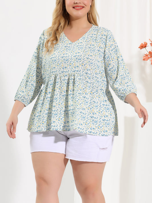 Women's Plus Size Top V Neck Babydoll Flowy 3/4 Lantern Sleeve Floral Blouse