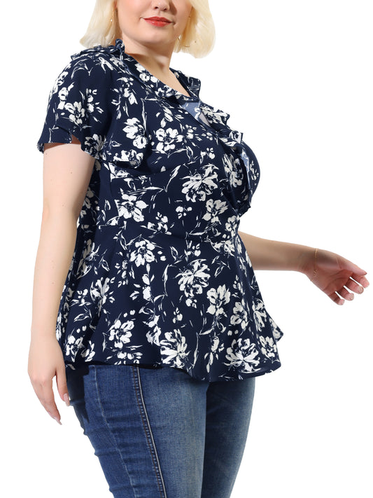 Women's Plus Size Short Sleeve Tie Waist Floral Print Blouse Peplum Summer Top