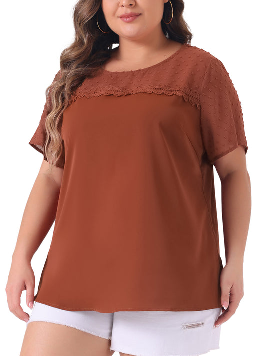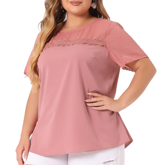 Women's Plus Size Round Neck Short Sleeves Polka Dots Lace Panel Summer Blouse