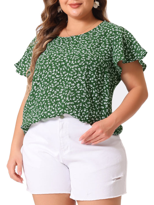 Women Plus Size Wrap V Neck Tie Waist Ruffle Sleeve Blouse Summer Floral Top