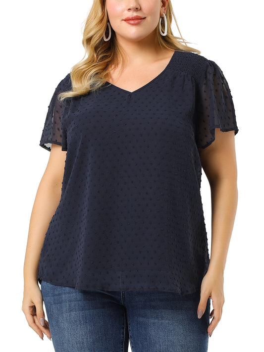 Women Plus Size Blouse Summer Pin Dots Smocked Flare Sleeve Top