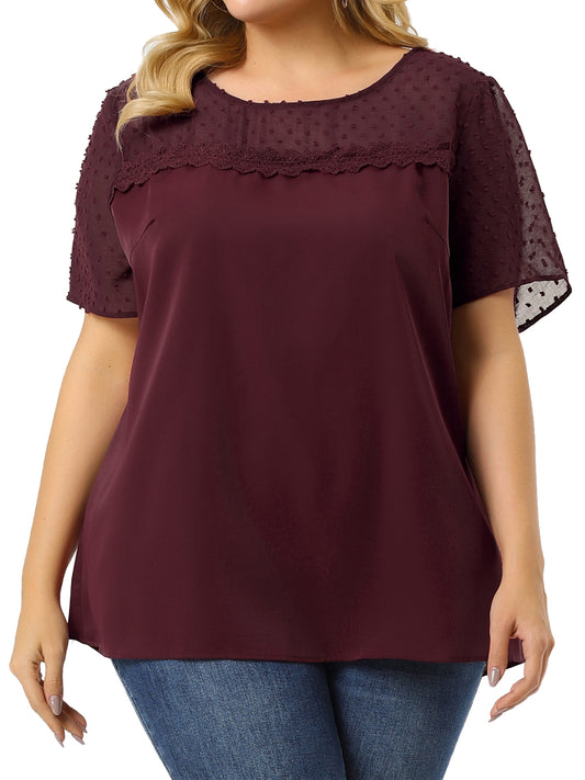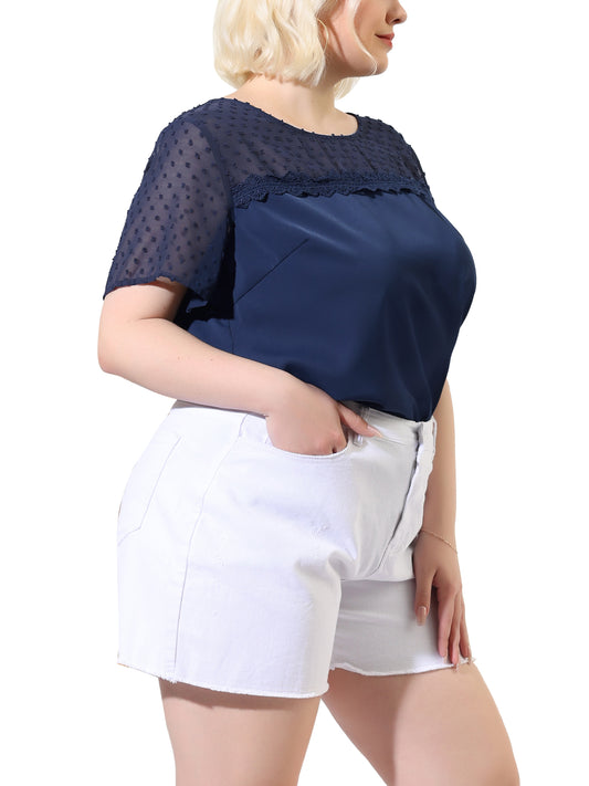 Women's Plus Size Round Neck Short Sleeves Polka Dots Lace Panel Summer Blouse