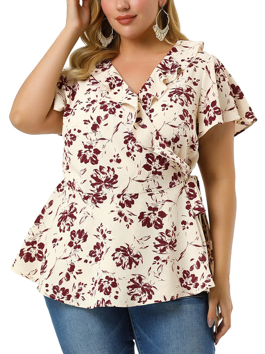Women Plus Size Wrap V Neck Tie Waist Ruffle Sleeve Blouse Summer Floral Top