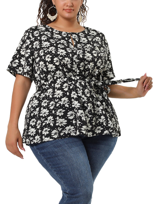 Women's Plus Size Short Sleeve Tie Waist Floral Print Blouse Peplum Summer Top