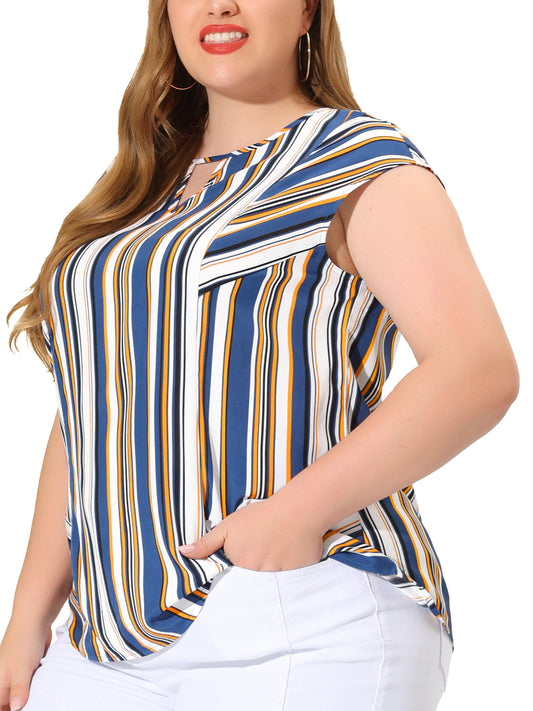 Women Plus Size Boho Top Keyhole Neck Cap Sleeves Striped Blouse