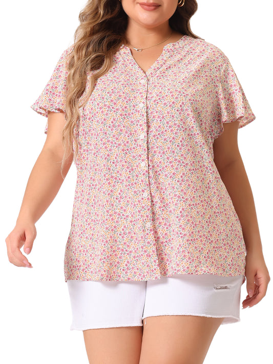 Women Plus Size Chiffon Flare Short Sleeve Button Down Floral Blouse Shirt