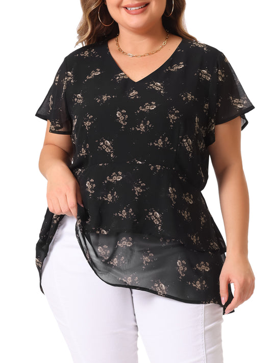 Women Plus Size Summe Tops V Neck Short Sleeve layered Floral Blouse