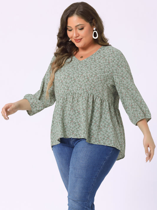 Women's Plus Size Top V Neck Babydoll Flowy 3/4 Lantern Sleeve Floral Blouse