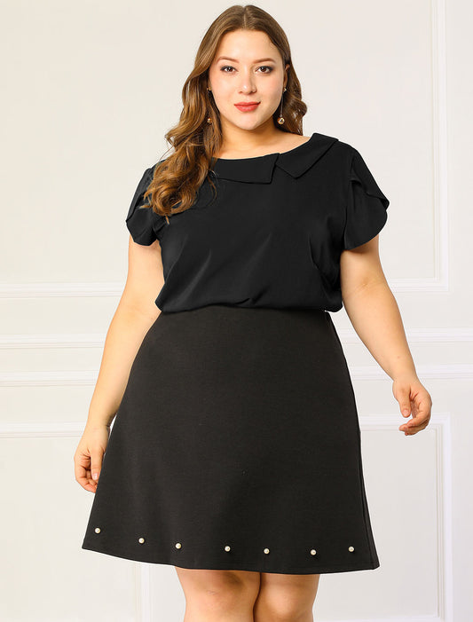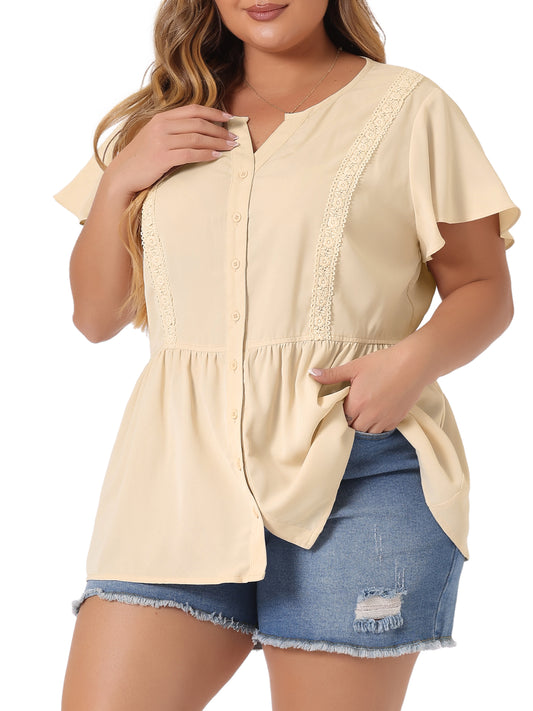 Women Plus Size Blouse Shirt Button Down V Neck Short Sleeve Flare Peplum Top