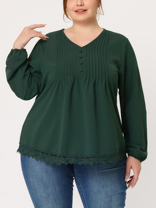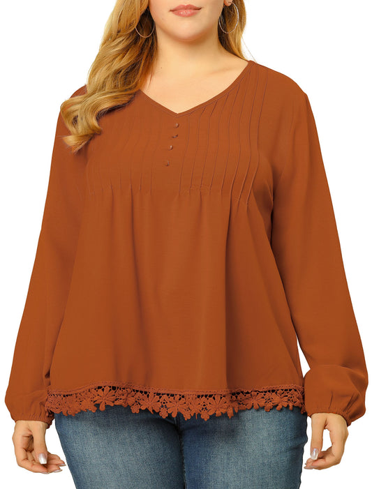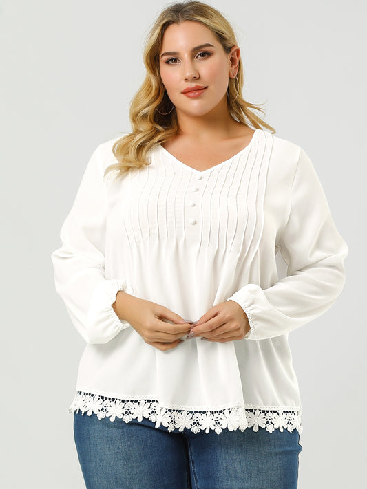 Women's Plus Size Top Casual Long Sleeves Pleated Lace Hollow Chiffon Blouse