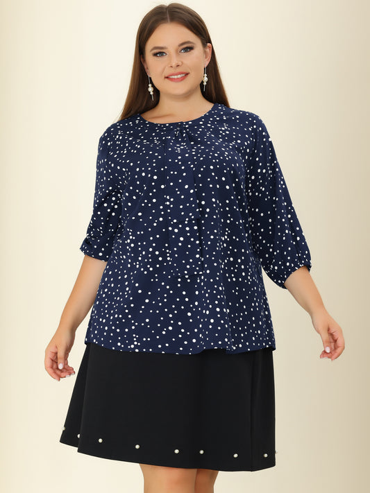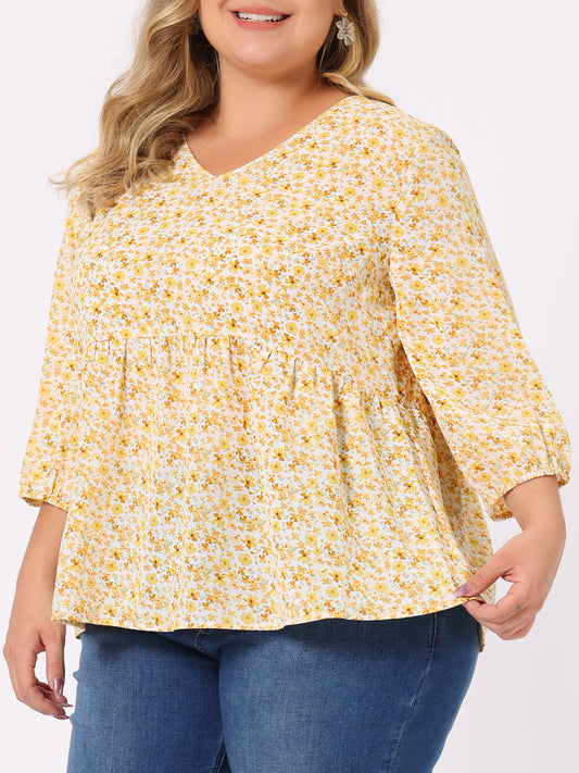 Women's Plus Size Top V Neck Babydoll Flowy 3/4 Lantern Sleeve Floral Blouse