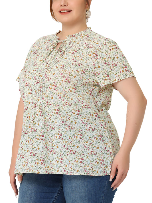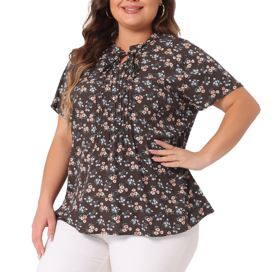 Women Plus Size Tie Neck Short Sleeve Pleated Floral Summer Blouse