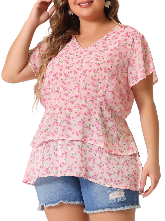 Women Plus Size Summe Tops V Neck Short Sleeve layered Floral Blouse