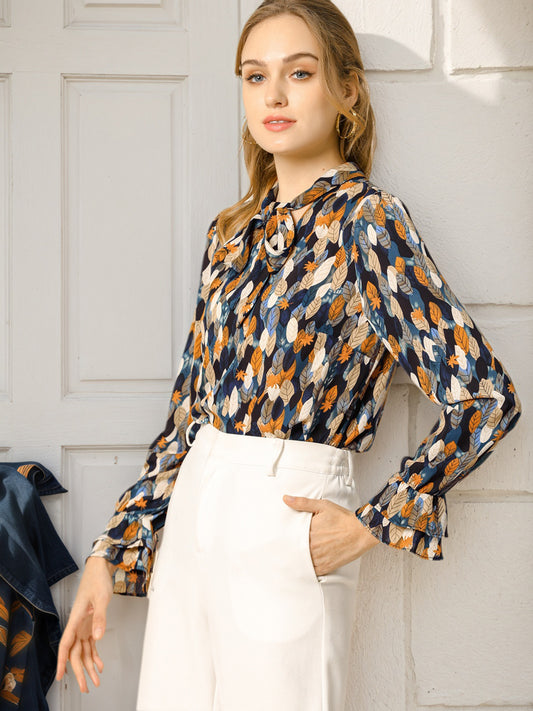 Women's Long Sleeve Blouse Floral Tie Neck Chiffon Ruffle Top (Available in Plus Size)