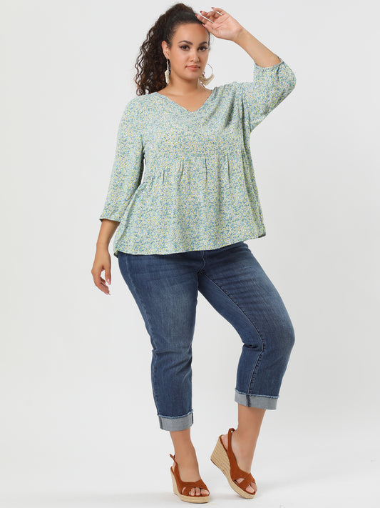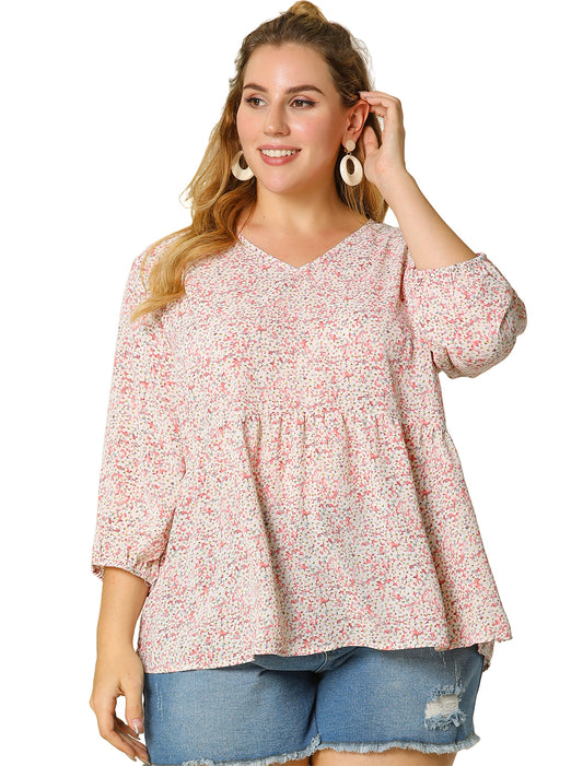 Women's Plus Size Top V Neck Babydoll Flowy 3/4 Lantern Sleeve Floral Blouse