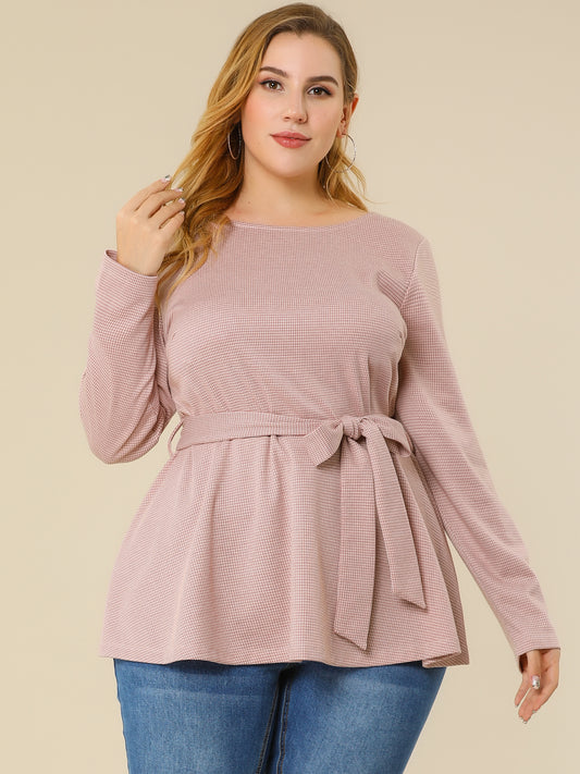 Women's Plus Size Peplum Top Belted Tie Houndstooth Blouse Long Sleeve Tunic