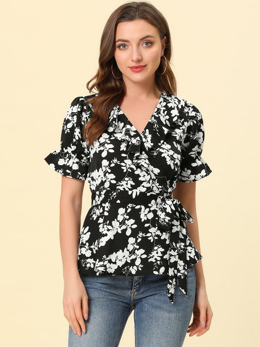 Women's Wrap Blouse Floral Short Sleeve Ruffle V Neck Belted Peplum Top (Available in Plus Size)