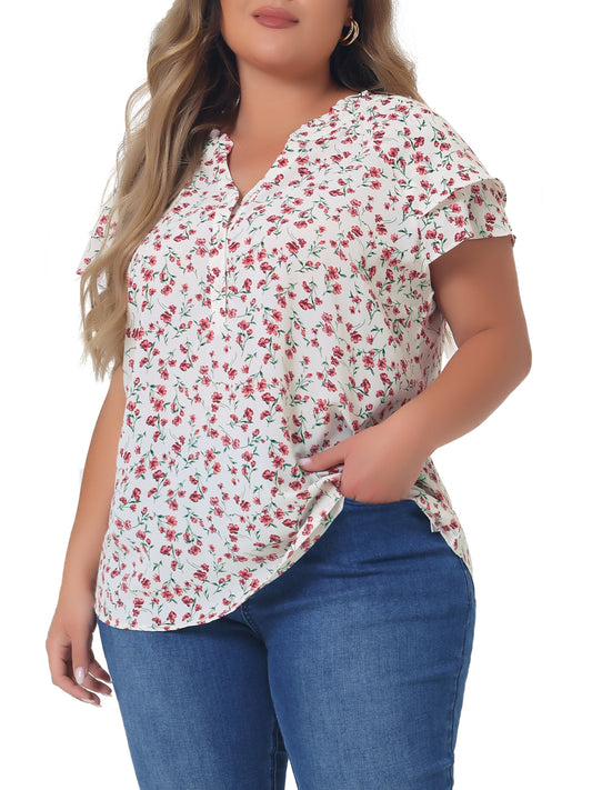 Women's Plus Size Top Floral Printed Ruffle Trim V Neck Layered Sleeve Blouse