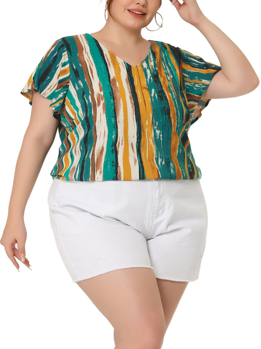 Women Plus Size Top Summer Short Sleeve V Neck Stripe Print Casual Blouse