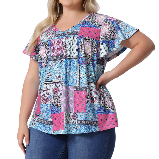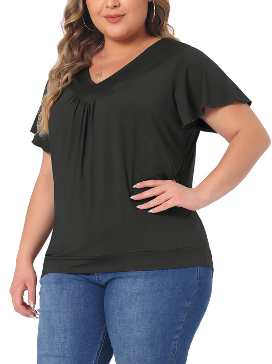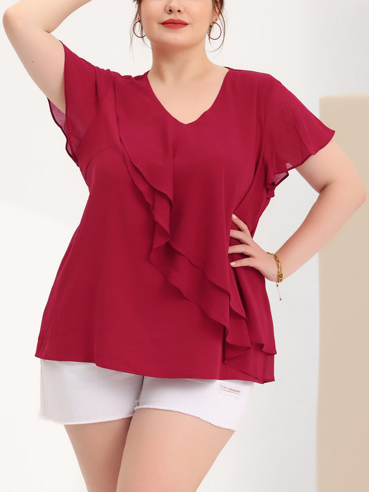 Women Plus Size Flutter Sleeves Tops V Neck Layer Chiffon Blouse Ruffle Top