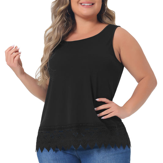 Women Plus Size Tops Round Neck Sleeveless Swing Lace Panel Flowy Tee Tops Summer