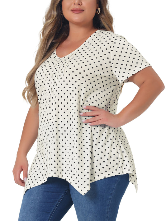 Women Plus Size Blouses Asymmetric V Neck Pintuck Short Sleeve Polka Dots Top