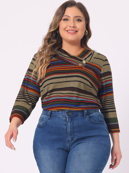 Women Plus Size Top 3/4 Sleeve Knit Striped Boho Asymmetric Neck T-Shirt Blouse