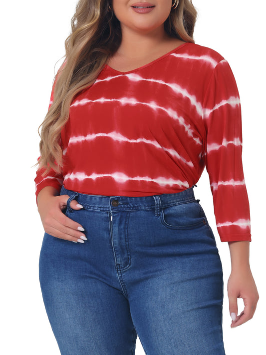 Women Plus Size T Shirt V Neck 3/4 Sleeve Loose Casual Blouse Striped Tie Dye Print
