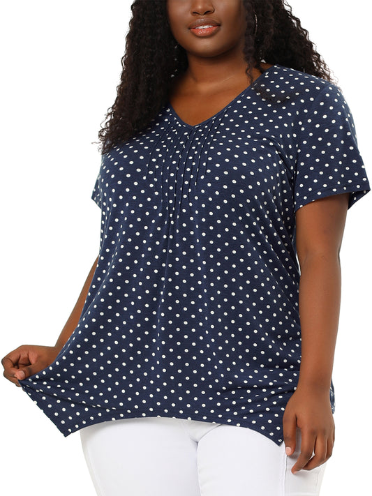 Women Plus Size Blouses Asymmetric V Neck Pintuck Short Sleeve Polka Dots Top
