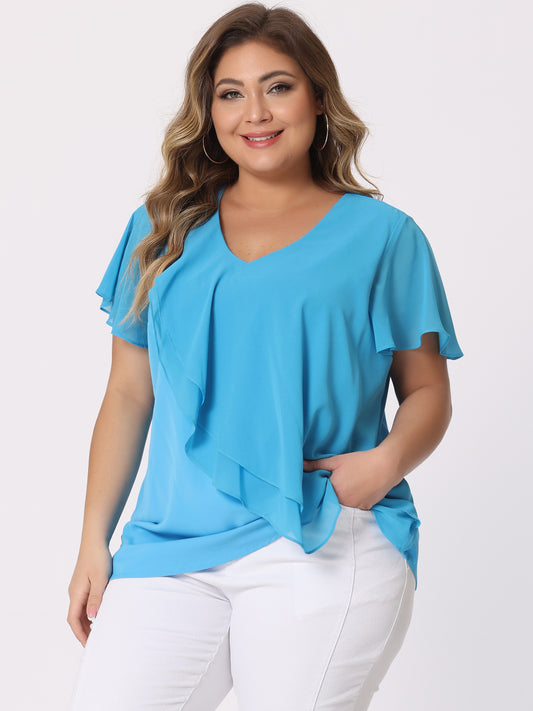 Women Plus Size Flutter Sleeves Tops V Neck Layer Chiffon Blouse Ruffle Top