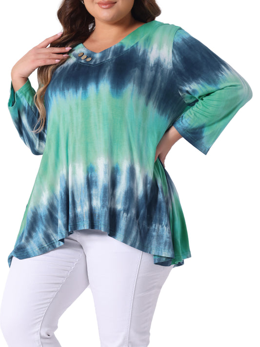Women Plus Size Tops V Neck Elbow 3/4 Sleeve Loose Fit Casual Tee Tie Dye T-Shirts