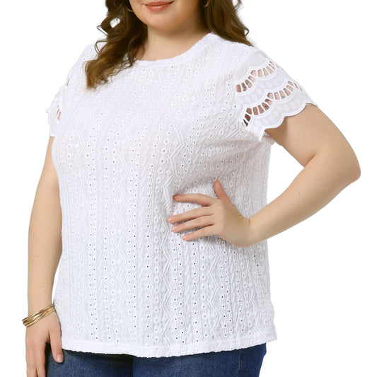 Women Plus Size Top Round Neck Lace Panel Hollow Short Sleeve Dressy Eyelet Blouse
