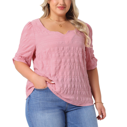Women Plus Size Top Textured Notched V Neck Short Sleeve Summer Blouse