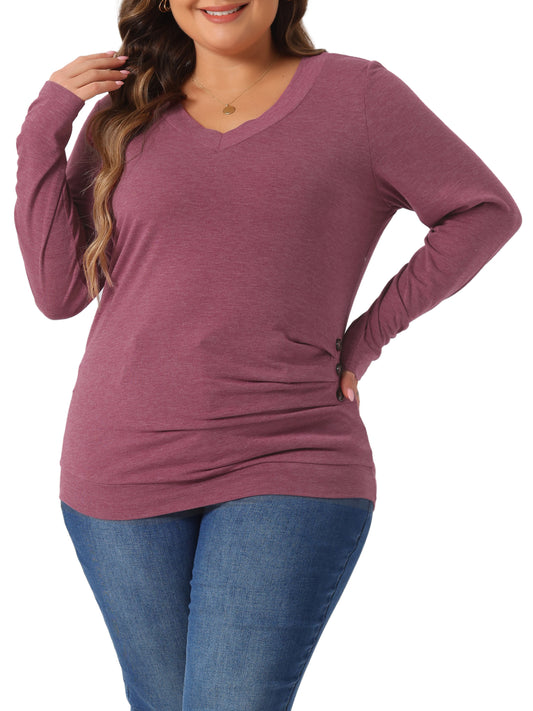 Women Plus Size Tunic Tops V Neck Long Sleeve Buttons Decor Ruched Casual Pullover