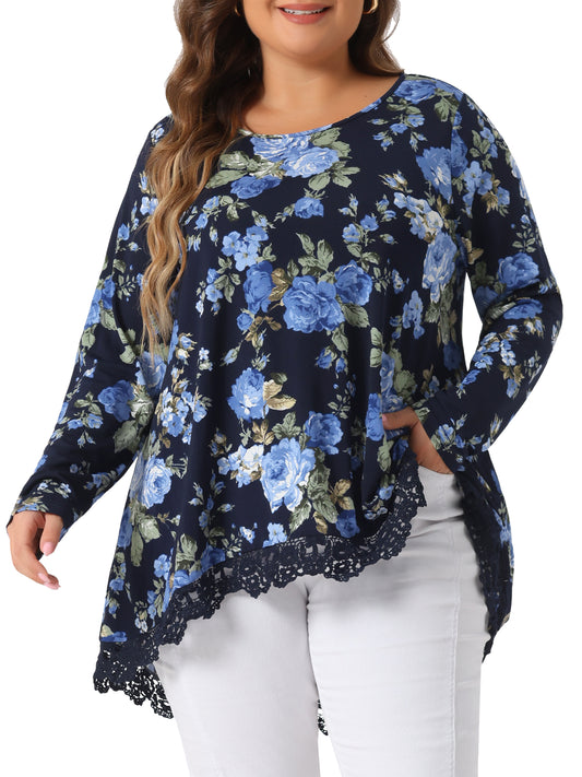 Women Plus Size Tops Crew Neck Lace Trim A-Line High Low Hem Floral Blouse Tunic Top