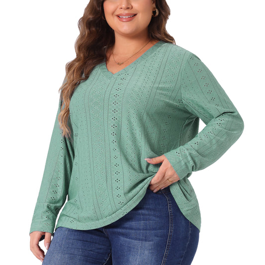 Women Plus Size Tops V Neck Long Sleeve Hollow Eyelet Tops Blouse Pullover T-Shirt
