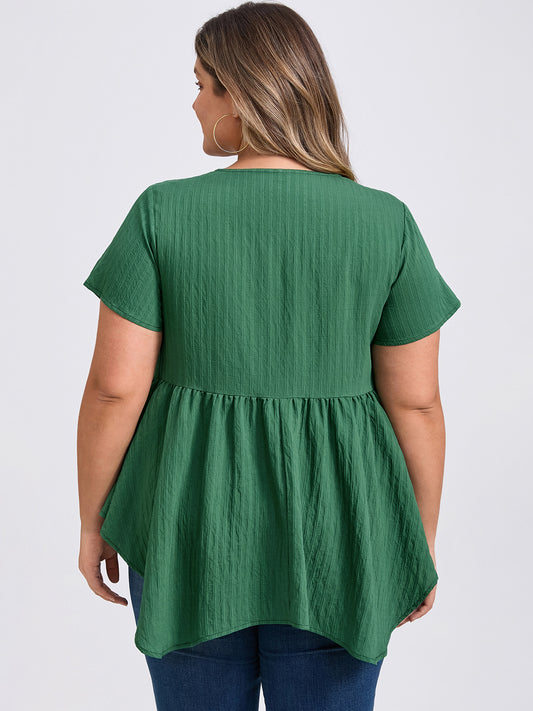 Women Plus Size Tunic Texture V Neck Short Sleeve Pintuck Blouse Button Decor Hanky Asymmetric Hem Babydoll Top