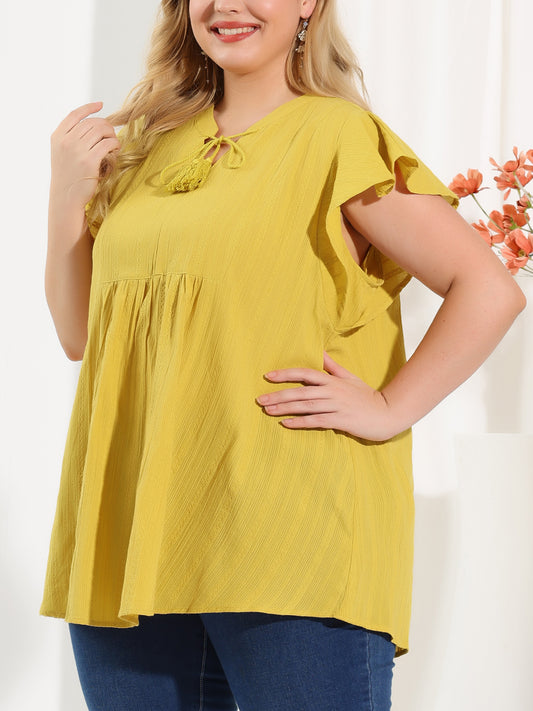 Women Plus Size V Neck Tassel Self Tie Flutter Short Sleeve Blouse Flowy Summer Top