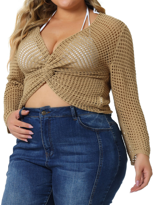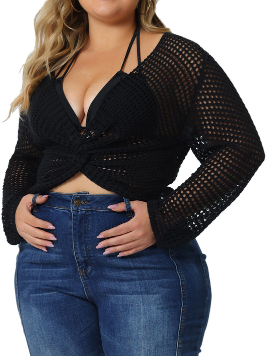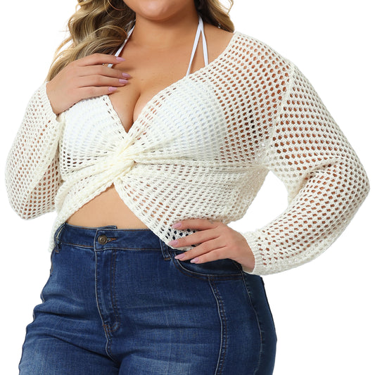 Women Plus Size Mesh Crochet Crop Top Hollow Out Knit Sweater Beach See Through Cover Ups