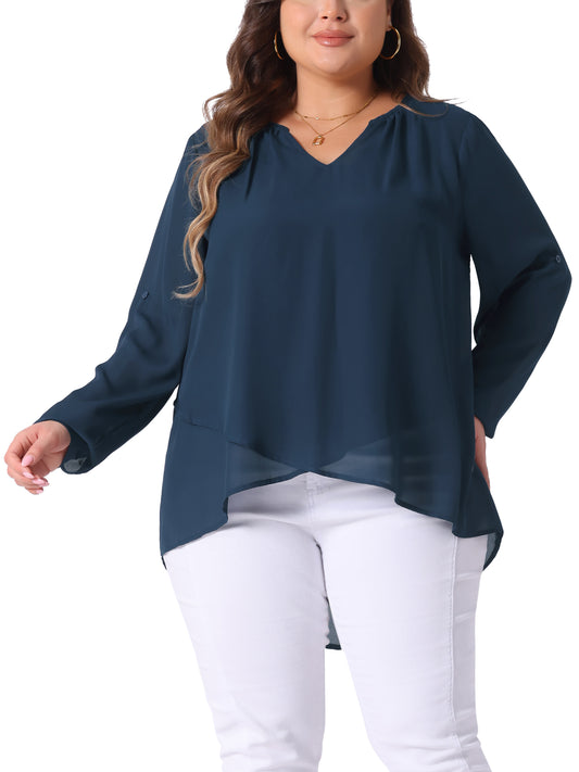 Women Plus Size Top Long Sleeve Notch V Neck High Low Hem Layer Casual Tunic Top