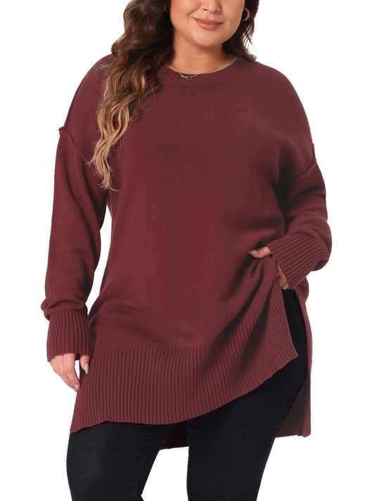 Women Plus Size Sweater Oversized Crew Neck Long Sleeve Slit hem Knit Pullover Sweater Tops