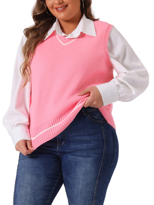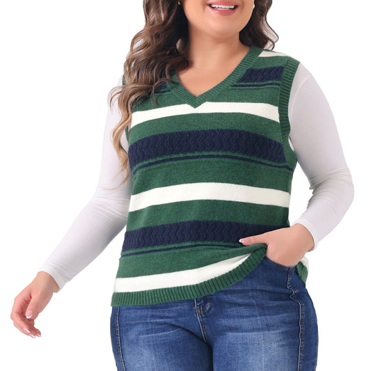 Women Plus Size Sweaters Sleeveless V Neck Striped Knit Casual Pullover Sweater Vests