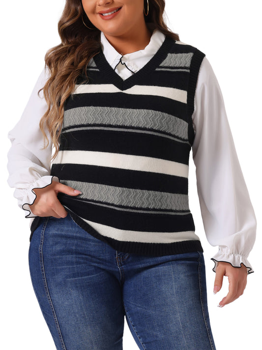Women Plus Size Sweater Vest V Neck Stripe Cable Knit Sleeveless Pullover Sweater Vest