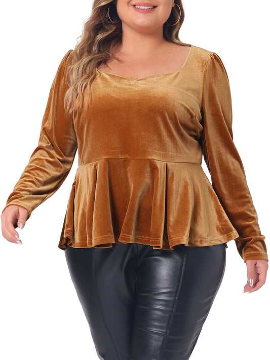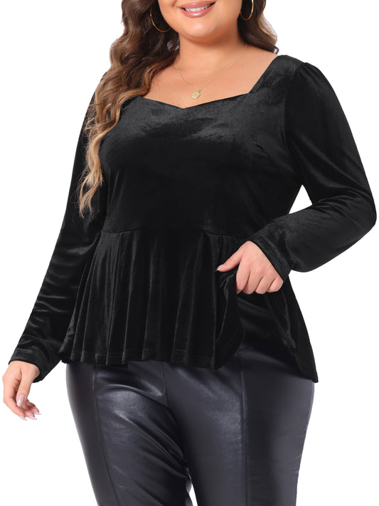 Women Plus Size Velvet Top Long Sleeve Sweetheart V Neck Peplum Blouse