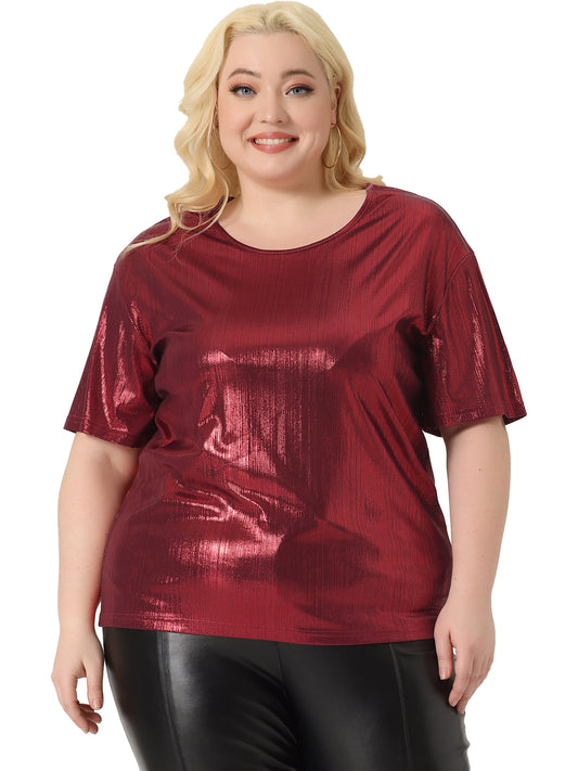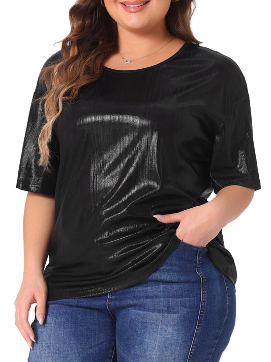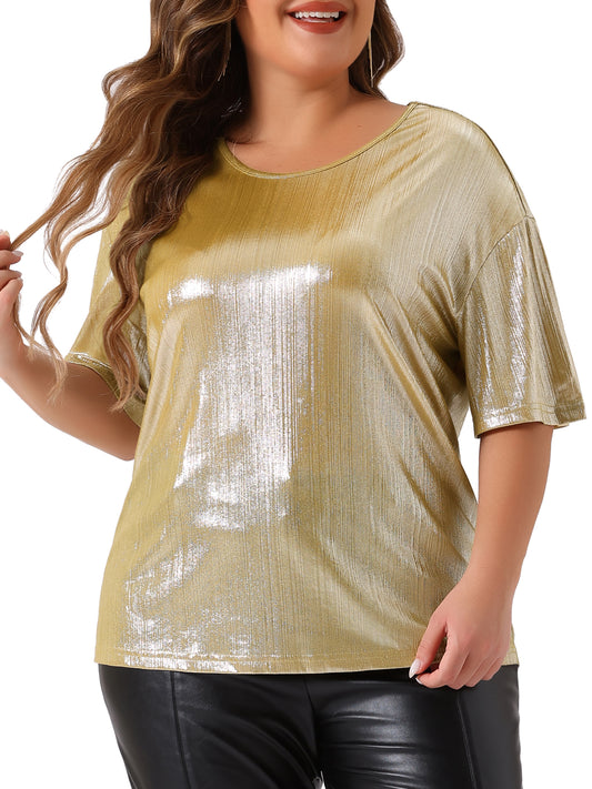 Women Plus Size Top Metallic Round Neck Short Sleeve T-Shirt Party Tee Top
