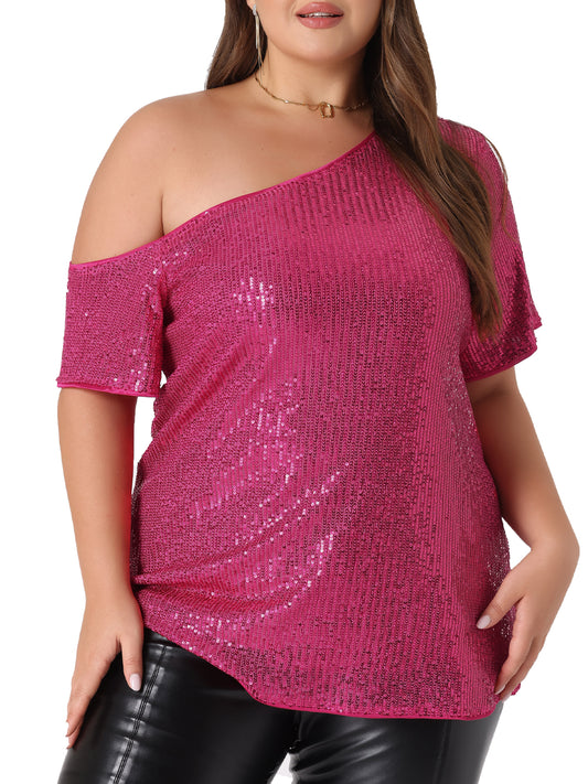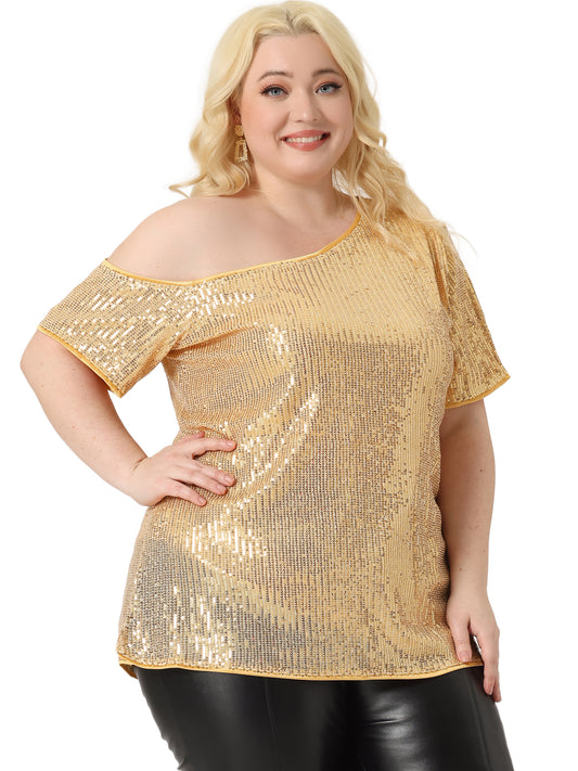 Women Plus Size Top One Shoulder Short Sleeve Metallic Blouses Party Sequin Top