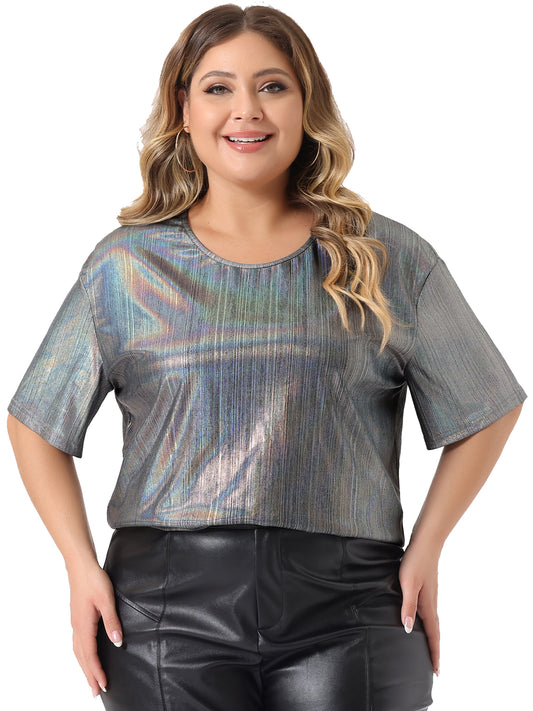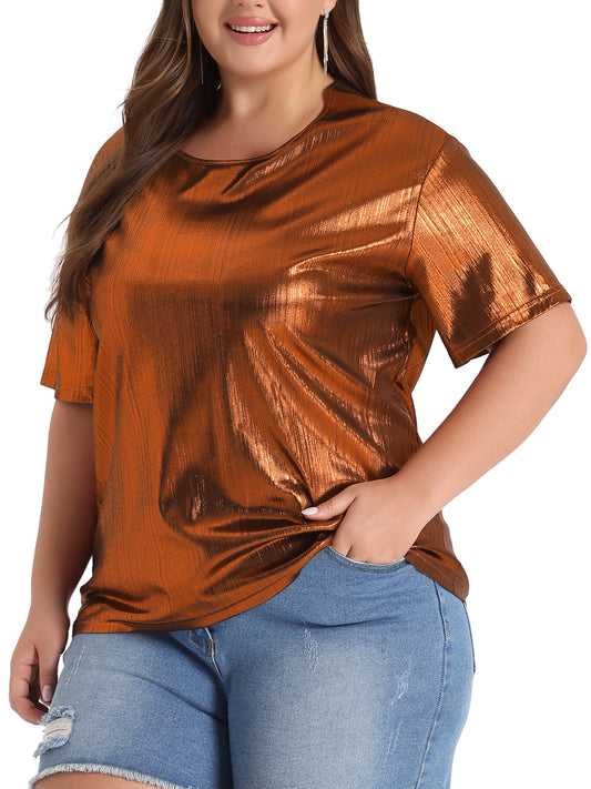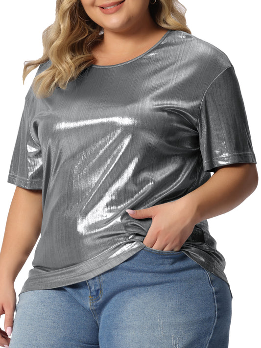 Women Plus Size Top Metallic Round Neck Short Sleeve T-Shirt Party Tee Top