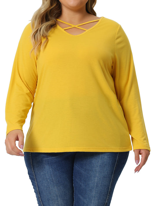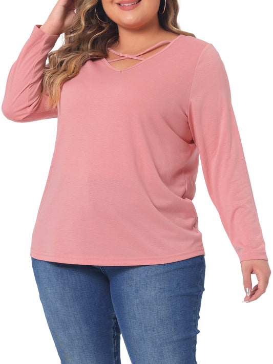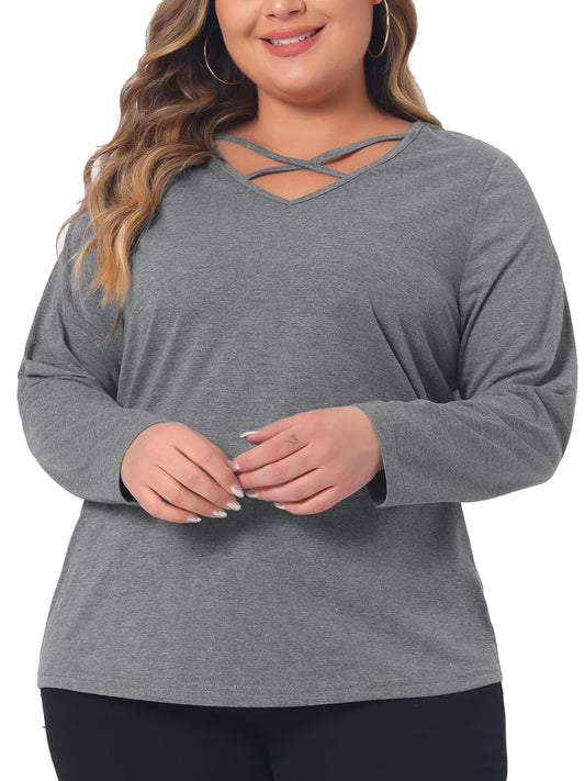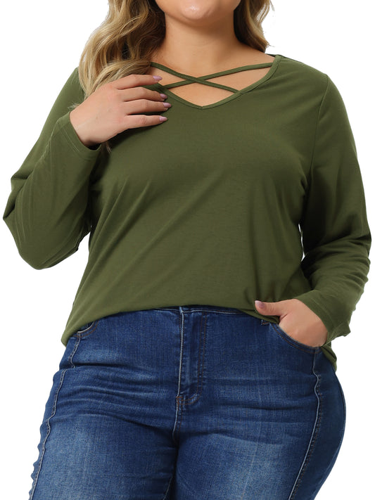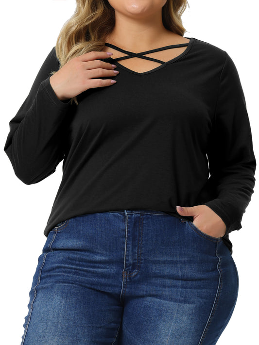 Women Plus Size Top Cross V Neck Casual Long Sleeves T-shirt