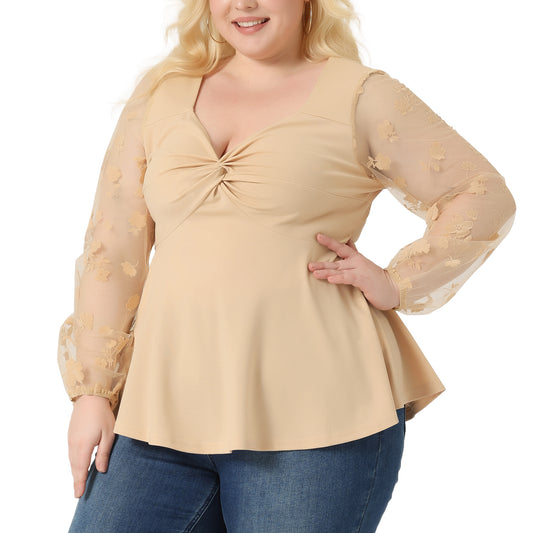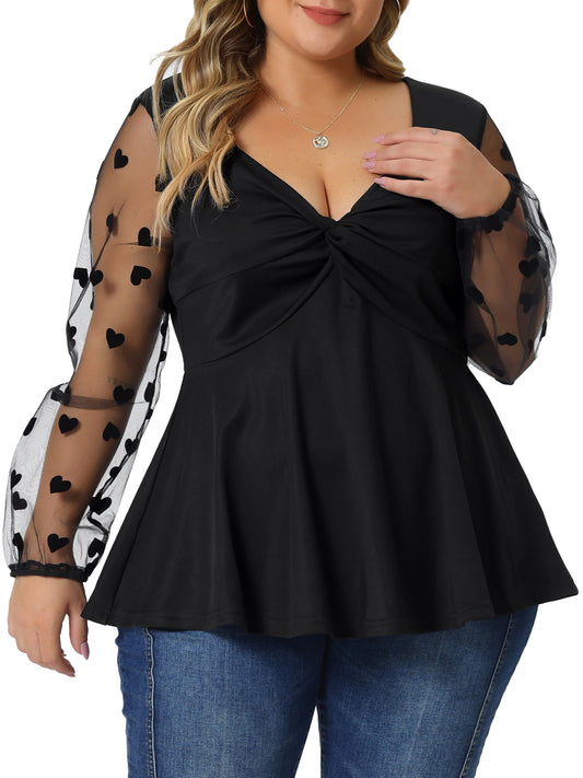 Women Plus Size Top Long Sleeve V Neck Mesh Sheer Peplum Top Babydoll Blouse